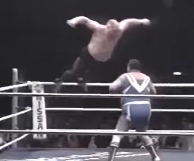Vader rarely faced men his size, so it’s wild to see his dominant style transpose itself so easily to Otto Wanz. That’s what’s so captivating about this. The stereotypical marquee Vader match (really any superheavyweight) is whether or not a smaller opponent – think Sting or Ric Flair – can outlast his opening onslaught. Here, Vader is the better conditioned athlete. 13 years removed from his first World Championship victory, Otto Wanz is fighting a man 12 years his junior, a man who, in just four years, had risen to the status of wrestling’s most fearsome monster heel, having caused a riot in Sumo Hall after defeating an Antonio Inoki who had already wrestled once that evening.