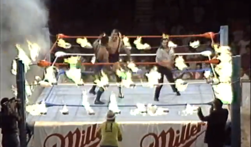 Being a wrestler in this fire match feels almost unthinkable. Hell, I'd dread even being a referee for this bout. Unlike the carefully managed pyrotechnics of the WWF's inferno match, there's a seat-of-your-pants, almost DIY quality to this match's set up that foreshadows the very best of the deathmatch genre to come. Instead of a well-kept border of fire on the apron, multiple torch-like pads are strung up on two lines that surround the ring. At the start of the video, one can even see the ringside attendants pouring lighter fluid onto each pad from a red solo cup. It's an image that sticks in the mind--the fact that they didn't even have that squeeze bottle out there to soak the rags, they just poured some of it into a cup and said, "Soak that shit."