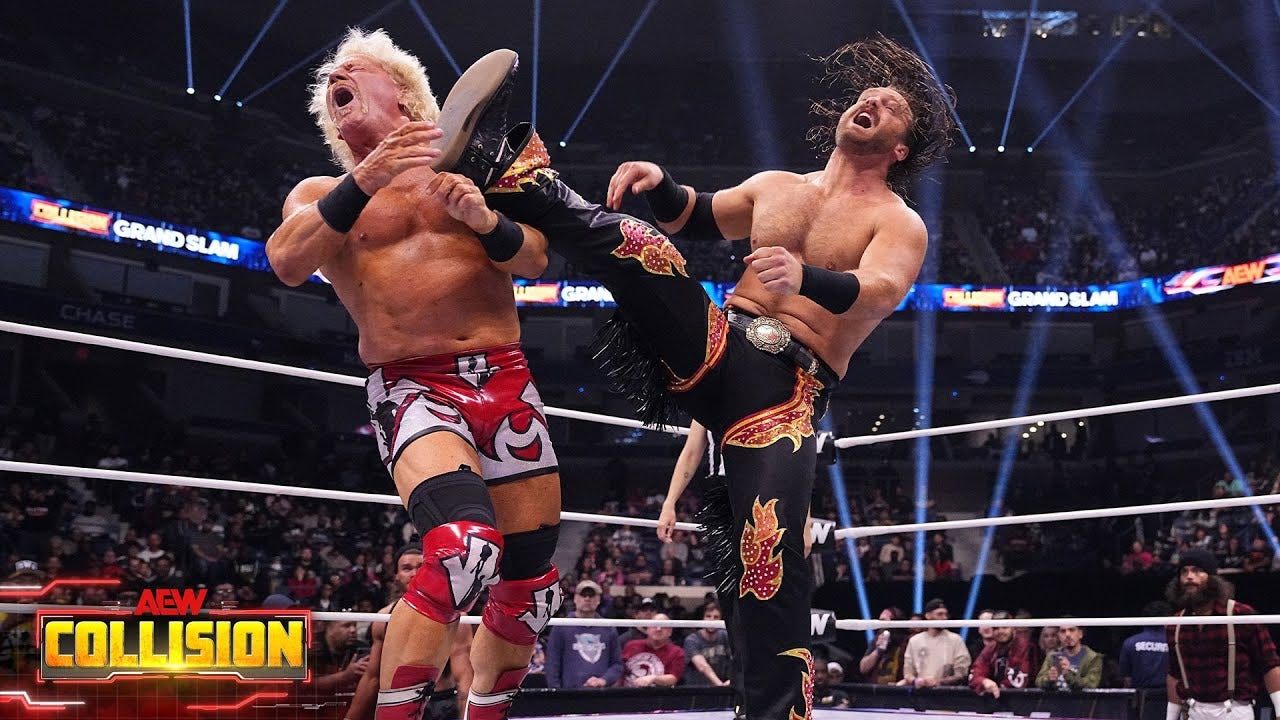 Realizing Nigel McGuinness would empty the tank and give everything he had to defeat career rival Bryan Danielson at Arthur Ashe Stadium, AEW officials called me in to join the Collision broadcast team for this special Grand Slam edition that was taped the same night as Dynamite. Much like baseball broadcasters always remember the first time they called a Shohei Ohtani at-bat, I will forever remember the first time I called a Double J Jeff Jarrett match which included the 7’4” Satnam Singh using a leather strap.