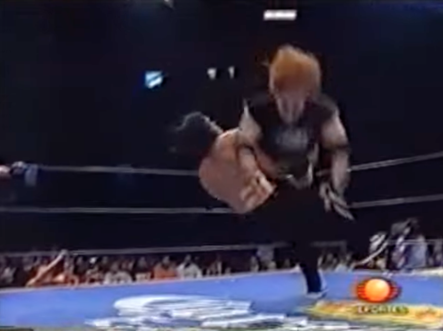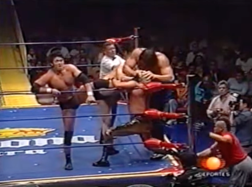 Whoever was booking CMLL in 2002 was a genius. I know nothing about the promotion at that time and am fine with my ignorance, but look at what they did here with three men — The Great Khali, Katsuyori Shibata, and Watoru Inoue — sent their way for a couple of dates in April 2002. When providence sends you a gigantic man and a junior heavyweight tag team, you don’t ask questions: you book something like this and let history tell you what you’ve done later. The Great Khali. Katsuyori Shibata. Teaming up in Arena Mexico. There’s no rush quite like stumbling onto a match where two of my favorite wrestlers, who may as well occupy entirely different universes, meet up, like a wizard blessed a copy of Fire Pro Wrestling with the ability to make exclusively shit that I want to see happen appear, like magic, on VHS tape.