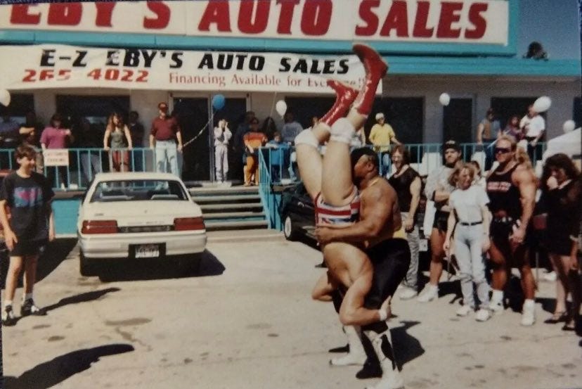 In my collection of wrestling photography, there’s a series of snapshots taken at a USWA spot show at the grand opening of a used car lot. There has never been a more perfect match for the great sport of professional wrestling than the gala affair of a small town auto dealership’s invitation to browse a selection of low milage Oldsmobiles, but while the ring looks great — correct, even — underneath the tinsel overhang, there’s something decidedly off about the presence of the wrestlers themselves. Garishly overmuscled and wearing wrestling trunks under the sweltering sun, the cartoon forms of “Gentleman” Chris Adams and the assorted misfits I can’t quite make out feel oddly fragile, as if the violence they’re meting out to each other for the assembled dozens could turn really ugly out on the asphalt.