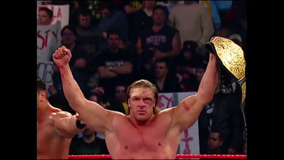 What’s perhaps most painful about it all as that all of this—the racism, the devastating match structure that rewards our heel, the sense of finality—is in service of something far pettier and pointless. As with so much of this particular World Title reign for Triple H, it all comes back to putting down WCW.