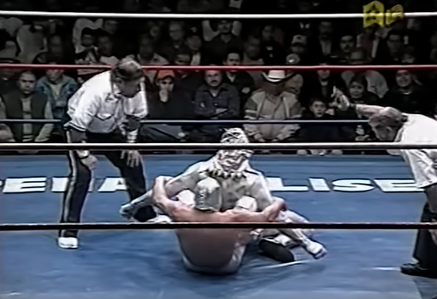 Here’s one of those, where commentary is quick to point out that Santito is the technico and La Parka is the rudo, but it’s Santito who attacks while the referees are still giving their instructions, a man out for vigilante style justice the night before the night before Christmas. He takes La Parka outside immediately, hurling him into the ringpost, hitting him with a DDT, eventually ripping his mask — a silver-and-white variant of Parka’s traditional black-and-white garb, a means of mocking the son of the silver-masked man and his family that will give him a canvas upon which to paint a masterpiece in the technico’s blood. A disagreement with a ringside second gives La Parka a second of respite, but only that: Santito is a heatseeking missile, wrapping the premiera caida quickly with a top rope tope and a camel clutch, forcing La Parka to tap. He is out to embarrass this man in a bone-deep way the likes of which nobody, not even WCW’s creative team, could imagine, and by all accounts it seems like he is going to get his way.