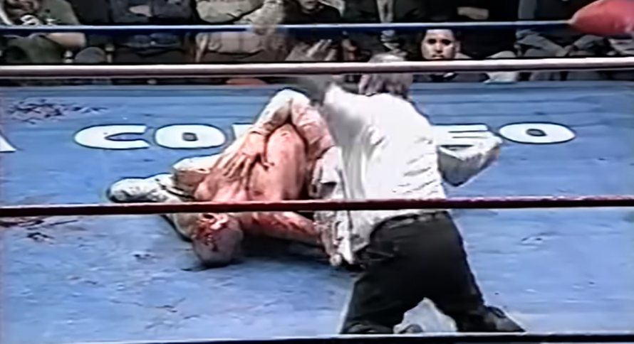 In wrestling, it’s almost the opposite. I know why my heart beats faster when a wrestler starts gushing blood — that’s a real man, that’s (usually) real blood, and the ticking clock nature of an athlete bleeding when combined with the artistic difficulty of holding something as physically and mentally taxing as a wrestling match together while bleeding out is a peculiar kind of magic, something that feels unique to the great sport of professional wrestling. But just the same, I’ve seen many wrestlers bleed in great quantity, and I don’t necessarily subscribe to the notion that most matches like this, if not all of them, have their places in history altered by the presence or absence of plasma on the mat. Does blood alone transfigure a match, transfix the eye? No. But when La Parka takes a bleeding Santito over to the ringside seats with white backing to throw him into them, and when the impact causes Santito’s blood to spatter against them as if the meat man from Hellraiser had sat there and scrawled “I am in Hell, help me” on them? Well, yes, at that point the blood matters, where I can tell you, as a fan and as a critic, that whatever this match was before El Hijo Del Santo started bleeding, it’s something else now, something you’d be a damn fool idiot (squeamishness aside) to not experience for yourself if you haven’t already.